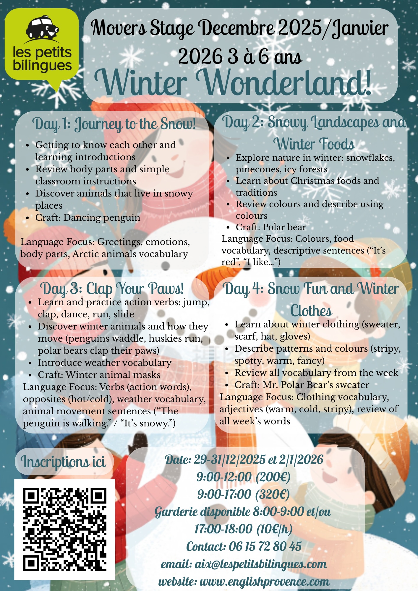 Pour toutes questions concernant les tarifs, veuillez nous contacter à l’adresse mail: aix@lespetitsbilingues.com ou appelez nous au 04 42 52 12 93